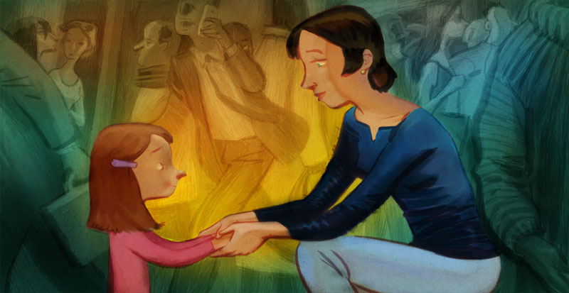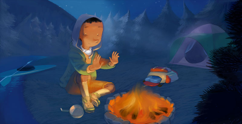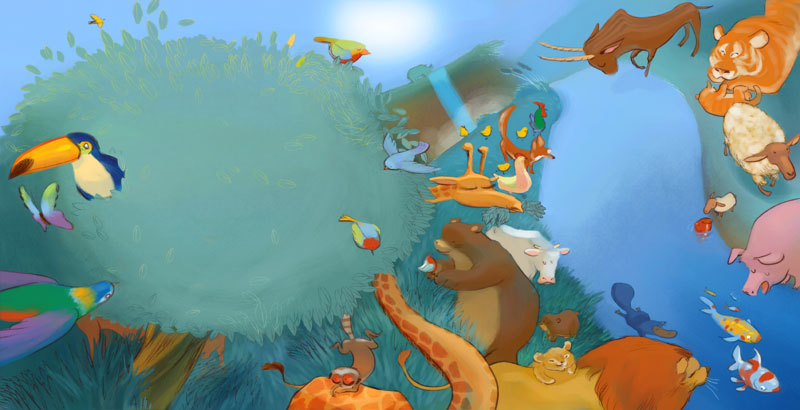 Une remarque concernant la double page 3: la 1ère version -bien que plus à mon goût- me semblait "trop dramatique donc trop orientée adulte". Finalement je ne leur ai proposé que la version plus claire (bien plus adaptée au livre et à son public). Mais vous pouvez voir cette version spéciale ici :-)