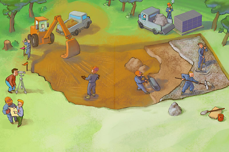 Le terrassier prépare le terrain, Claude lui montre où vont se placer les murs. Puis le maçon étale une couche de pierres et une de sable avant de couler une dalle en béton.