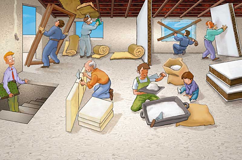 Claude a réglé le problème de la poutre et les travaux reprennent. Sous le toit, on déroule la laine de verre pour isoler du froid. Les maçons montent des cloisons de plâtre.