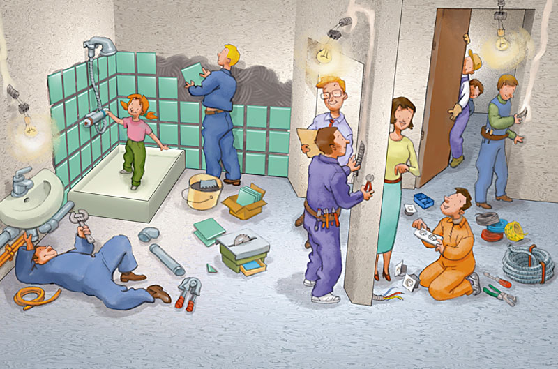 Quelle agitation sur le chantier! Le carreleur pose les carreaux de la douche. Le plombier fixe le lavabo mais l'eau n'arrive pas encore. En fait, tout existe sans exister!