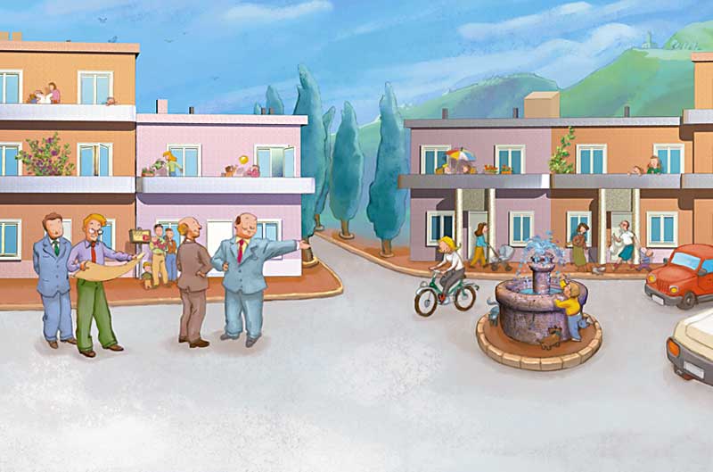 Claude est à l'écoute, il va devoir combiner tout ce que le maire lui demande. Il imagine déjà les maisons, la petite place avec une fontaine et un parc pour les enfants.