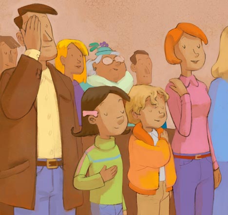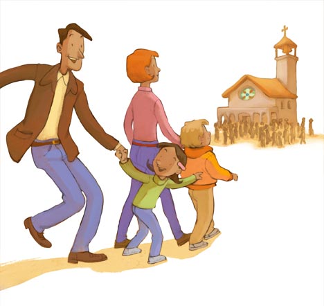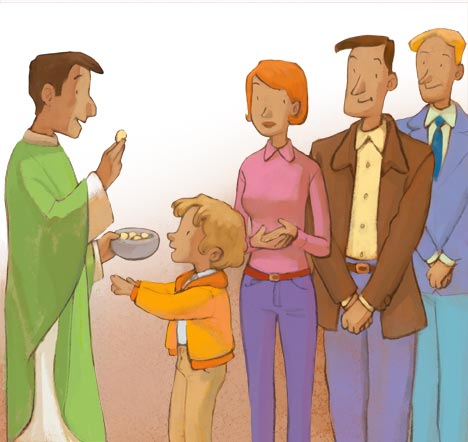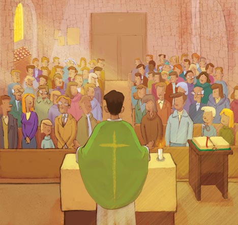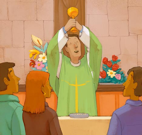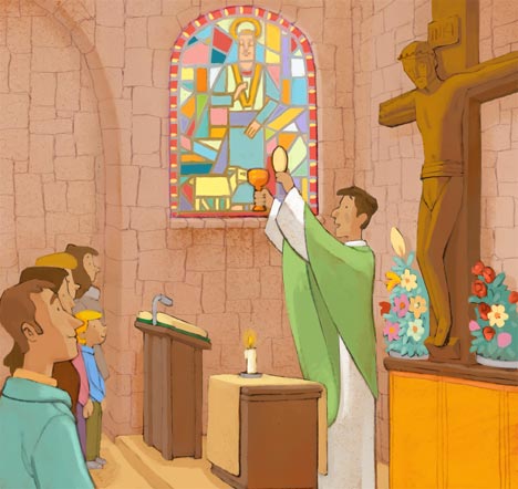 Expliquer -avec des mots simples et de grandes illustrations- le déroulé d'une messe dominicale: les paroles et gestes du prêtre et de toute l'assemblée.