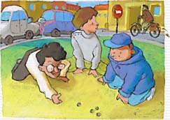 Je suis en train de jouer aux billes avec mes voisins Simon et Aurélien. J'ai déjà perdu deux parties. Il faut