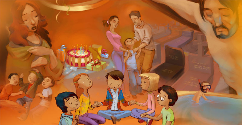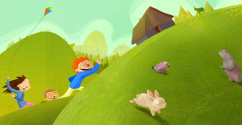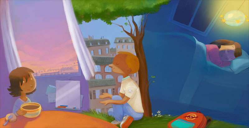 Une remarque concernant la double page 3: la 1ère version -bien que plus à mon goût- me semblait "trop dramatique donc trop orientée adulte". Finalement je ne leur ai proposé que la version plus claire (bien plus adaptée au livre et à son public). Mais vous pouvez voir cette version spéciale ici :-)