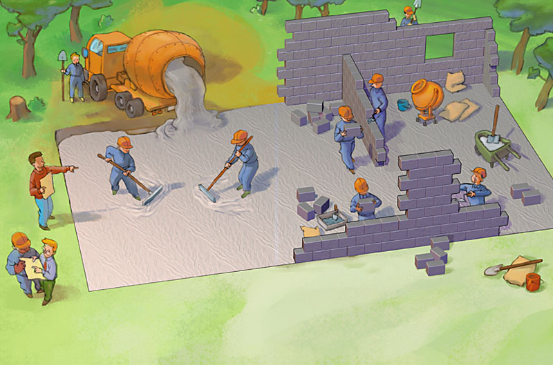 Le terrassier prépare le terrain, Claude lui montre où vont se placer les murs. Puis le maçon étale une couche de pierres et une de sable avant de couler une dalle en béton.