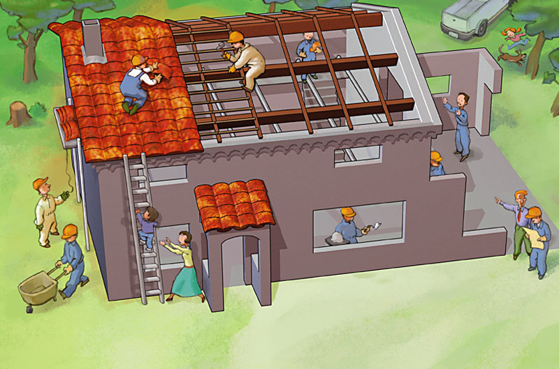 Claude est content du charpentier qui fait le toit. Il a presque fini de poser les liteaux et le couvreur accroche déjà les tuiles dessus. Claude retravaillera avec eux:
