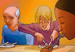 Il prend sa fourchette comme un poignard et il la plante dans un morceau de pain. La mamie a sursauté. Noël prend son couteau et il attaque le saucisson.