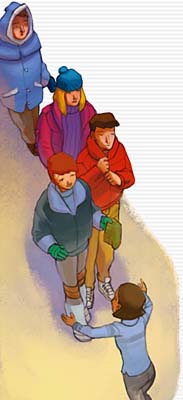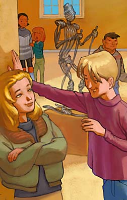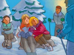 Si c’est comme l’année dernière, elle ne fera rien du tout à cause de la soirée-lumbago-de-Papa, la sortie-bronchite-de-Noël et la sortie-gastro-de-Romarine. Moi, j’aimerais bien m’inscrire à des activités avec les autres jeunes, mais je n’ose pas. Je cherche Noël des yeux pour qu’on s’inscrive ensemble. Il est à moitié caché derrière une statue en fil de fer qui représente un genre de skieur. Il est déjà lancé à fond dans ses activités de la semaine. Il baratine une blondasse en prenant un air avantageux, appuyé contre le mur. Je ne suis pas méchante, mais je lui souhaite la même bronchite que l’an dernier. C’est difficile de tousser et d’embrasser en même temps.