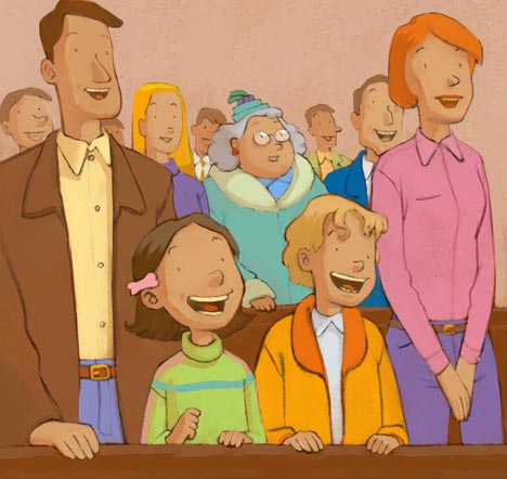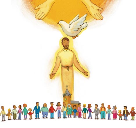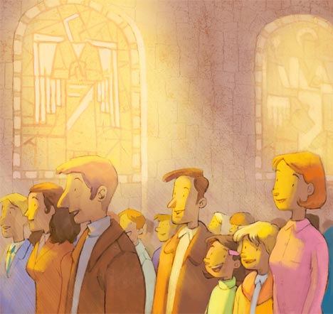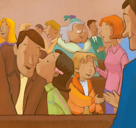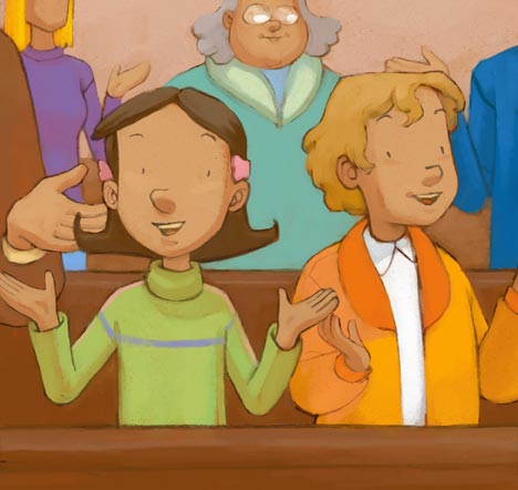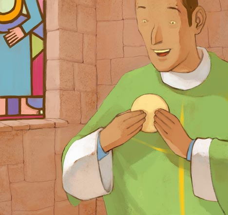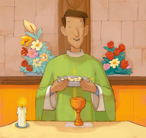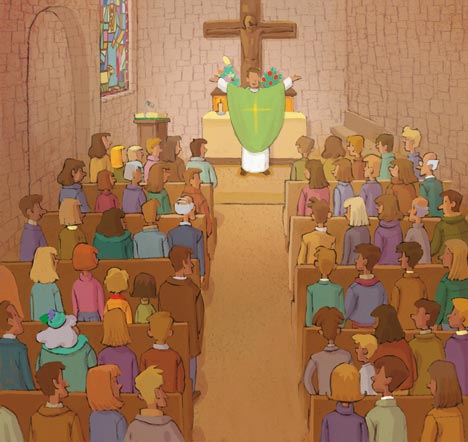 Expliquer -avec des mots simples et de grandes illustrations- le déroulé d'une messe dominicale: les paroles et gestes du prêtre et de toute l'assemblée.